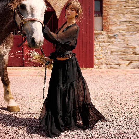 2 Piece Set Lace Chiffon Cardigan Top Long Skirt Spring Traveling Cruise Outfits for Woman Matching Sets