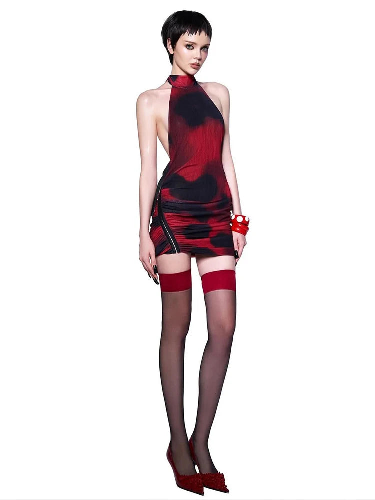 Backless Sexy Dress Women Halter Lace-Up Irregular Ruched Metal Buckle Summer Trend Midnight Sleeveless Mini Bodycon