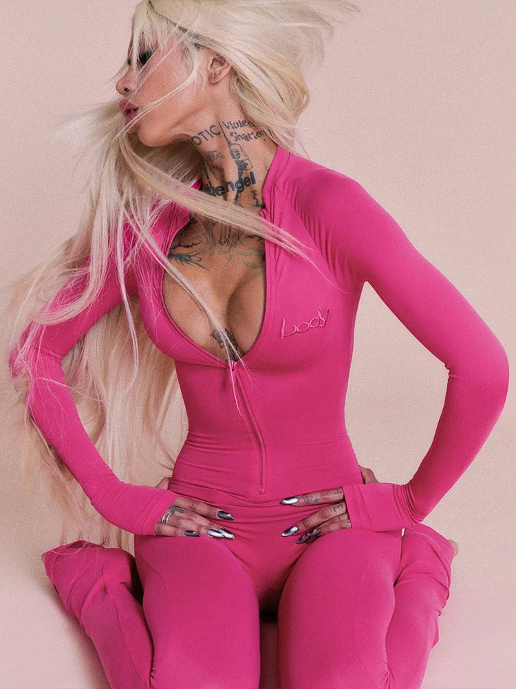 Basic Flared Jumpsuit Women Zip Letter Embroidery Full Sleeve Coquette Stretch Skinny Midnight Party Workout Overalls