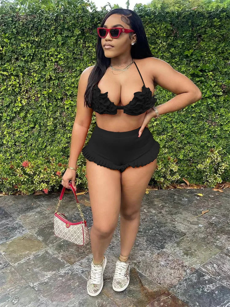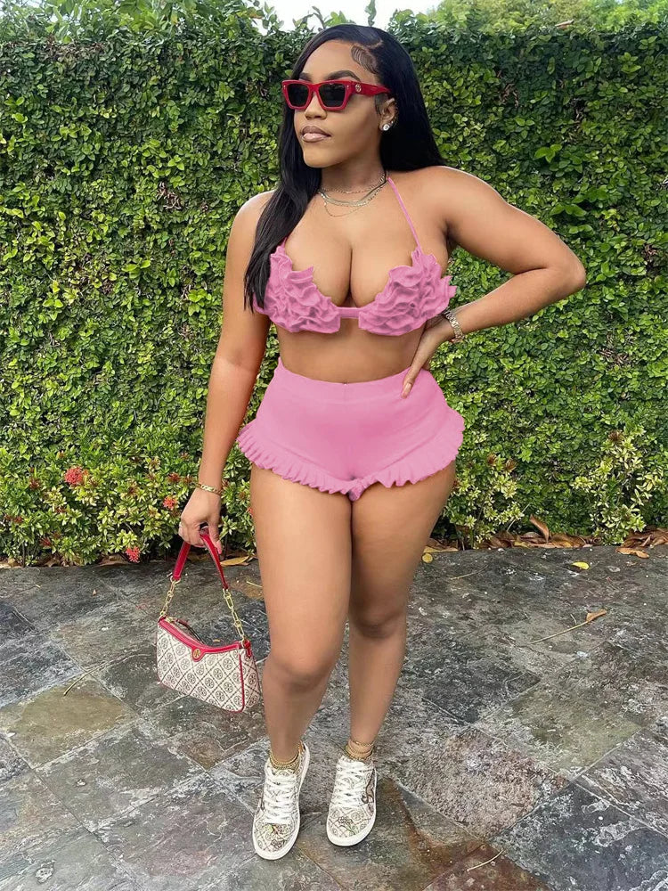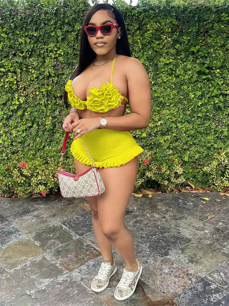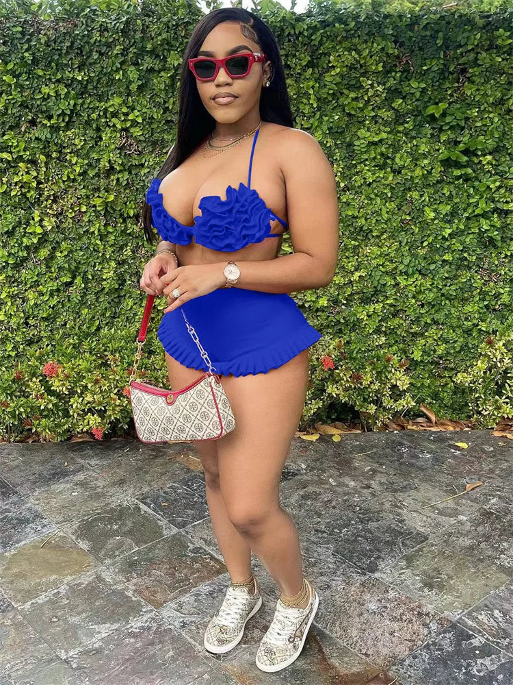 Beach Style 2 Piece Set Women Haltere Backless Ruched Bra+Ruffles Skinny Skirts Vacation Fashion Sexy Hipster Outfits