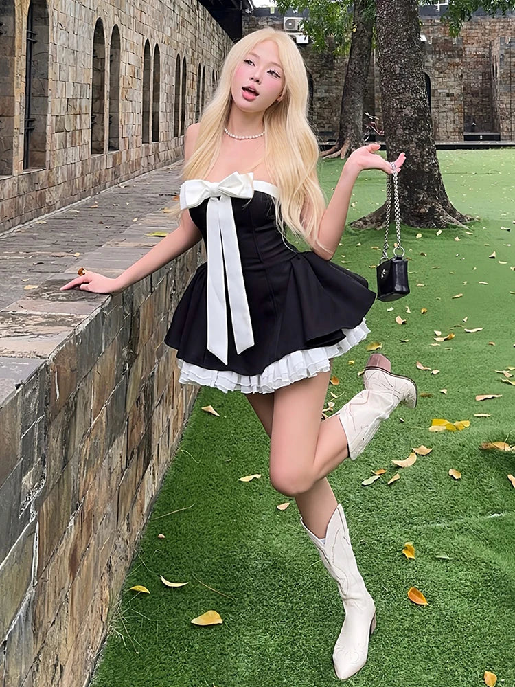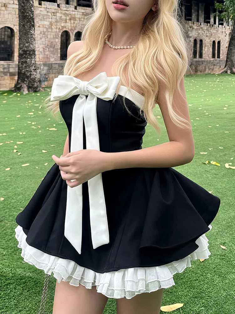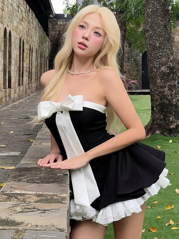 Bow Ribbon Dress 2-Piece Set Women Patchwork Strapless Ball Gown+Sweet Flares Tierred Skirt Elegant Birthday Outfits