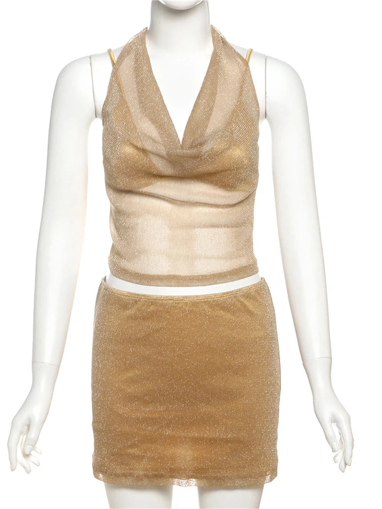 Bright Silk 2 Piece Set Women Lace-Up Halter Low-Neck Mesh Patchwork Crop Tops+Ruched Skirts Midnight Elegant Outfits