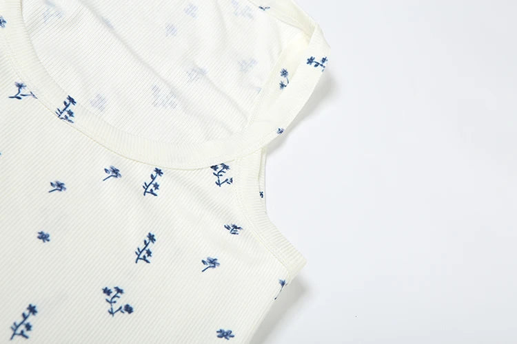 Casual Ribbed 2 Piece Set Women Flower Print Squard Collar Tops+Straight Pants Matching Daily Simple Elegant Suits