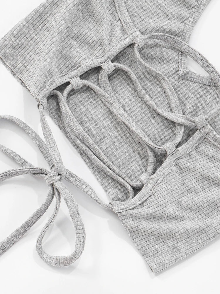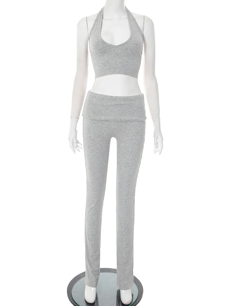 Casual Ribbed Women 2 Piece Set Casual Backless Bandage Halter Tank Tops+Lapel Pants Matching Stretch Sexy Streetwear
