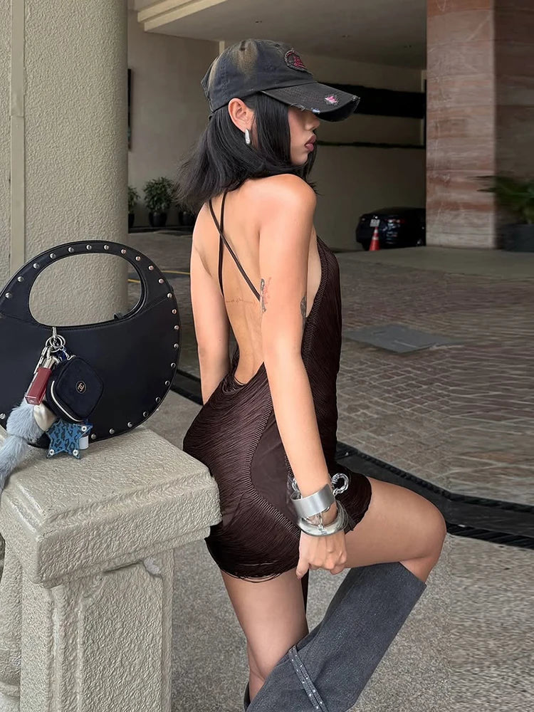 Chic Tassel Swing Collar Dress Women Sexy Halter Backless Sleeveless Skinny Midnight Street Club Basic Wild Mini Bodycon