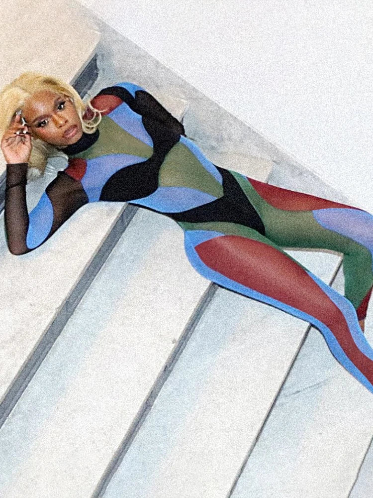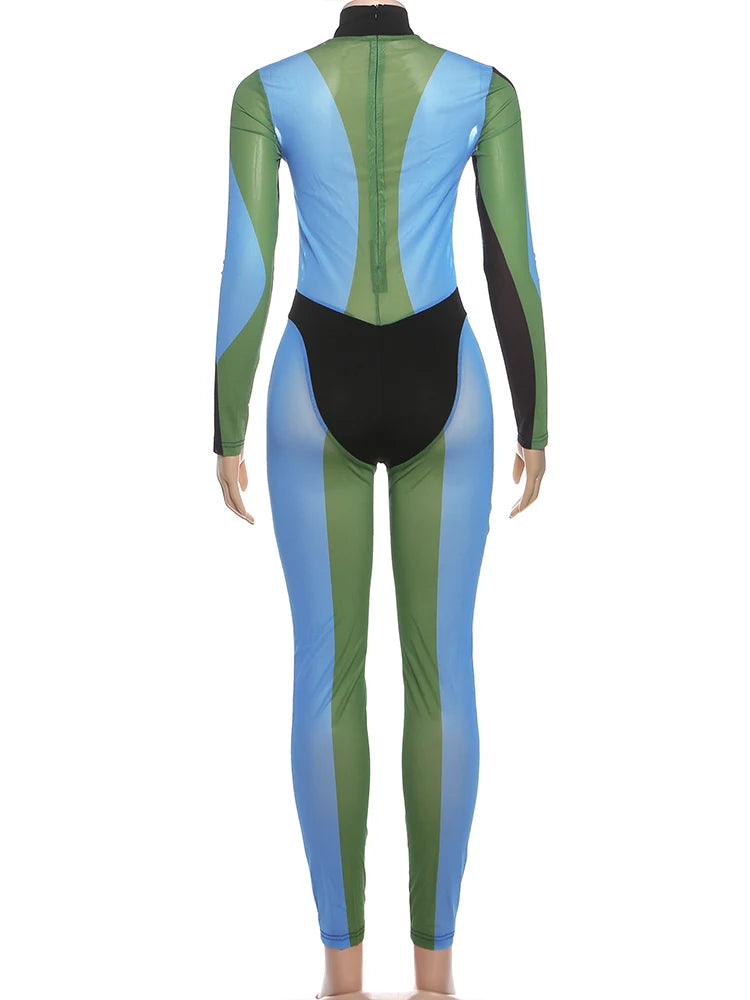 Colorful Print Jumpsuits Woman Turtleneck Full Sleeve Sexy See Through Skinny Peach Hip Hottie Street Fashion Overalls