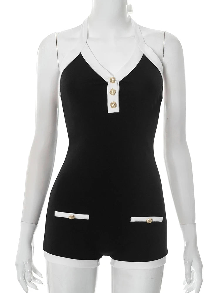 Contrast Patchwork Playsuits Women Lace-Up Halter Low-Neck Backless Button Decoration Skinny Peach Hip Fashion Romper
