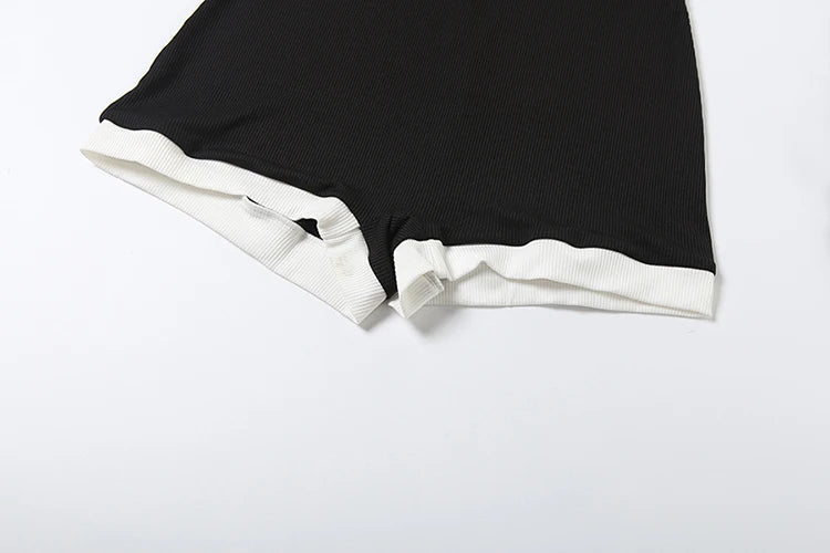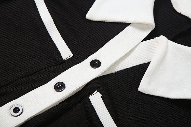 Contrast Patchwork Playsuits Women Ribbed Button Polo-Neck Full Sleeve Skinny Stretch Wrap Hip Street Fashion Rompers