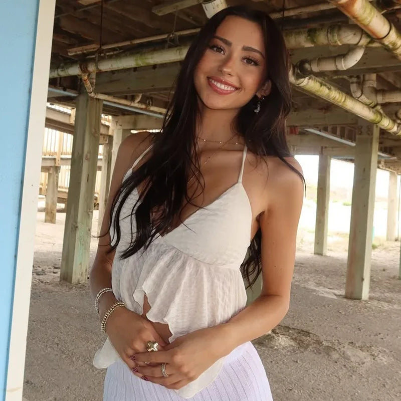 Coquette Tank Tops for Woman V Neck Irregular Hem Backless Crop Top Sexy Summer Camis