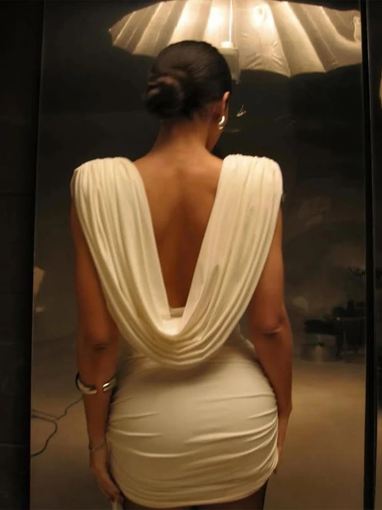 Deep V-Neck Mini Dress Woman Backless Sleeveless Skinny Peach Hip Sexy Fashion Midnight Club Party Ruched Elegant Bodycon