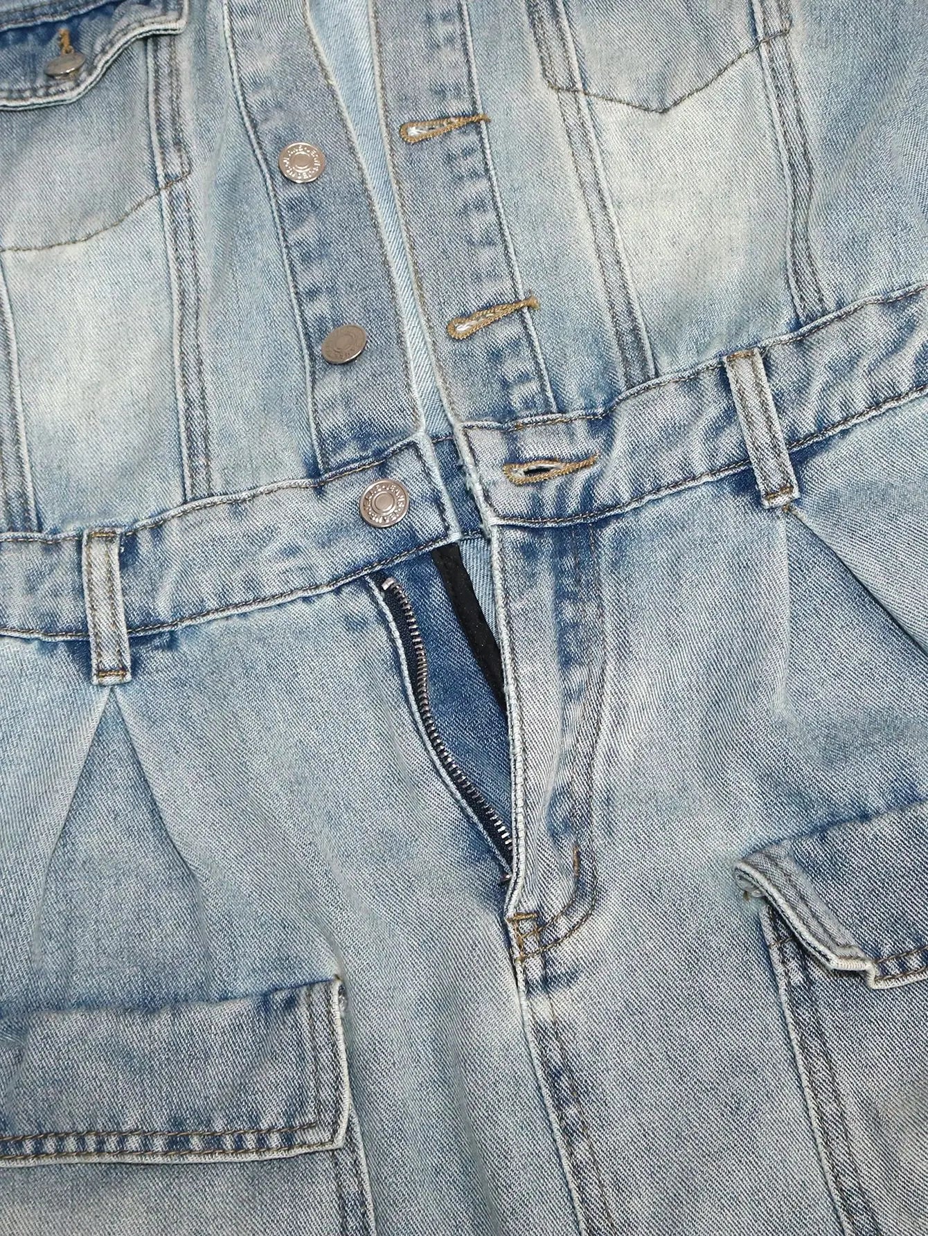 Denim 2Piece Set Women Patchwork Single-Breasted Dress+Zip Metal Trim Leg Sleeve Hottie Trend Street Vintage Outfits