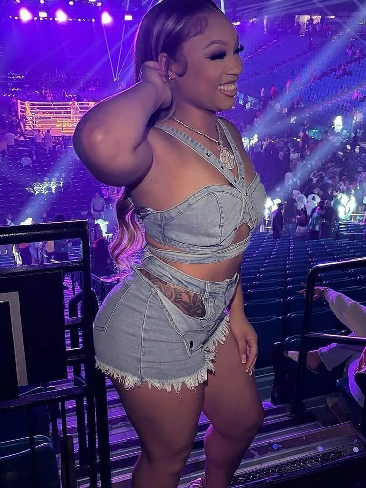 Denim Women 2 Piece Set Summer Women Irregular Hollow Casual Sporty Tank Tops+Patchwork Shorts Matching Streetwear