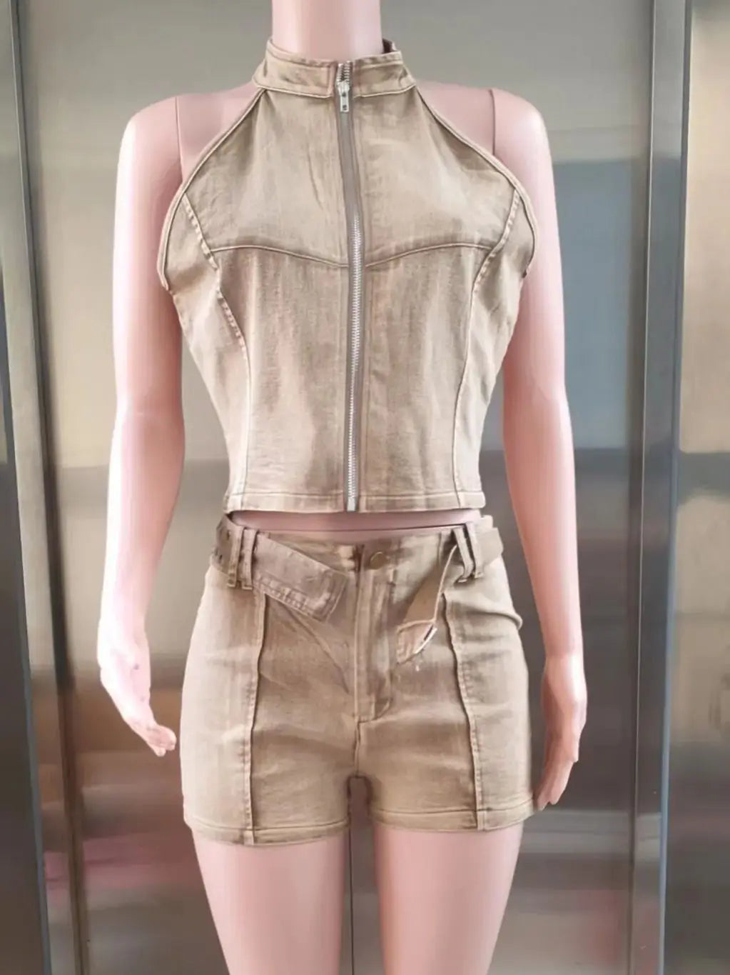 Distressed Style Denim 2 Piece Set Women Zipper Cardigan Sleeveless Crop Top+Skinny Shorts Hottie Street Hipster Suit