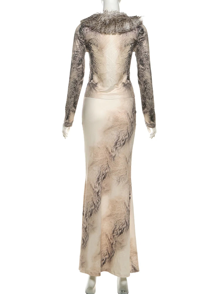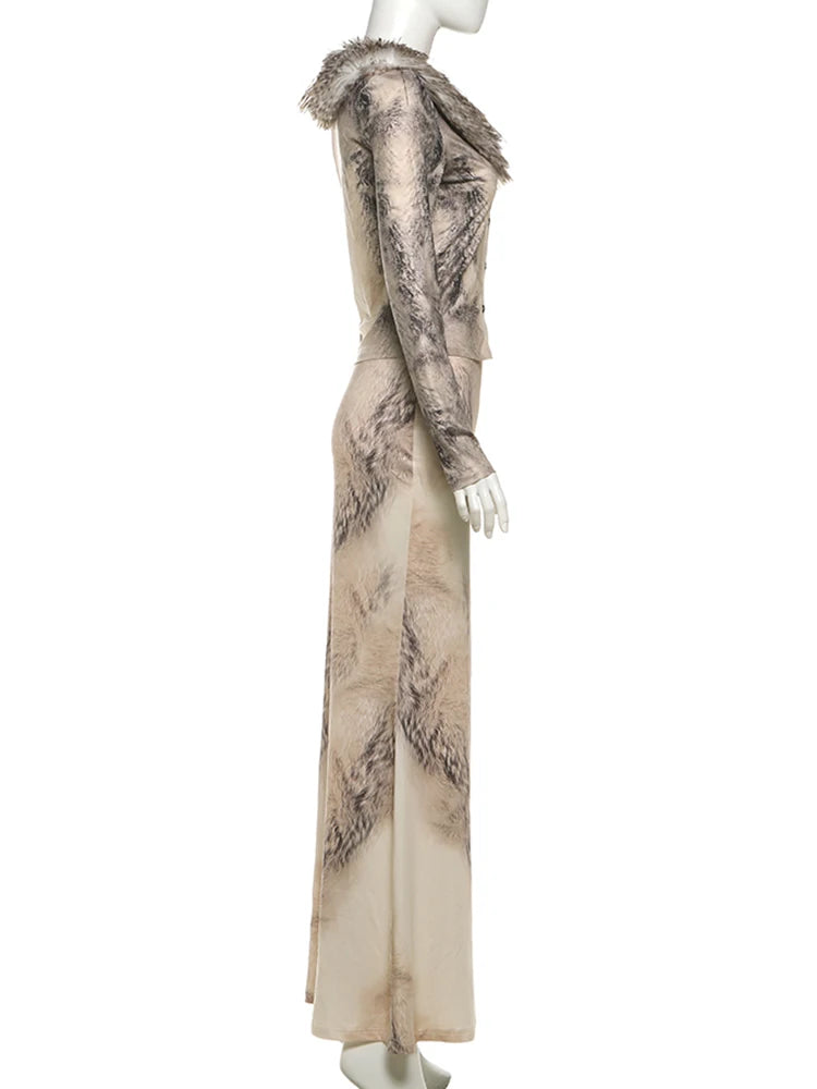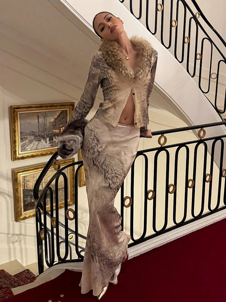 Elegant 2-Piece Set Women Fur Collar Single Breasted Crop Tops+Skirt Matching Streetwear Tight Luxury Skinny Outfits