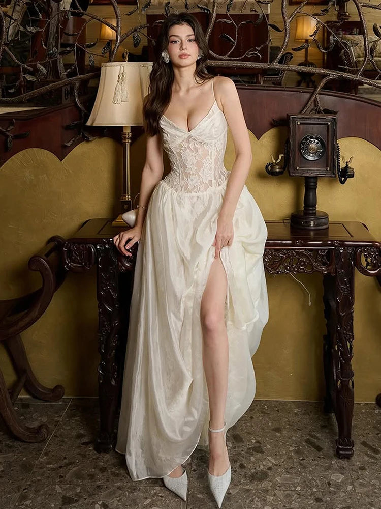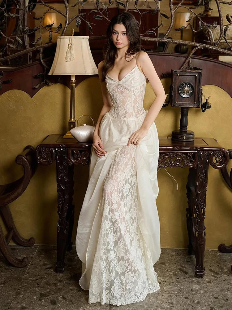 Elegant Jacquard Dress Women See Through Lace Patchwork Sleeveless V-Neck Party Banquet Fashion Chic Activity Outfits