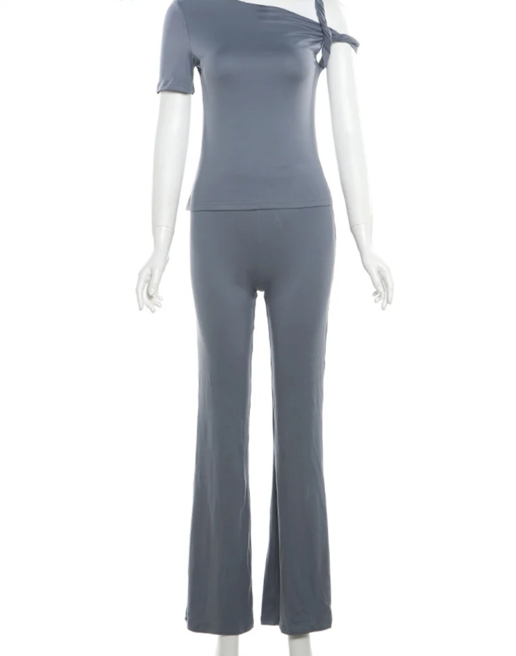 Elegant Women 2 Piece Set Stretch Irregular Knot Short Sleeve Tank Tops+Flare Pants Matching Stretch Slim Streetwear