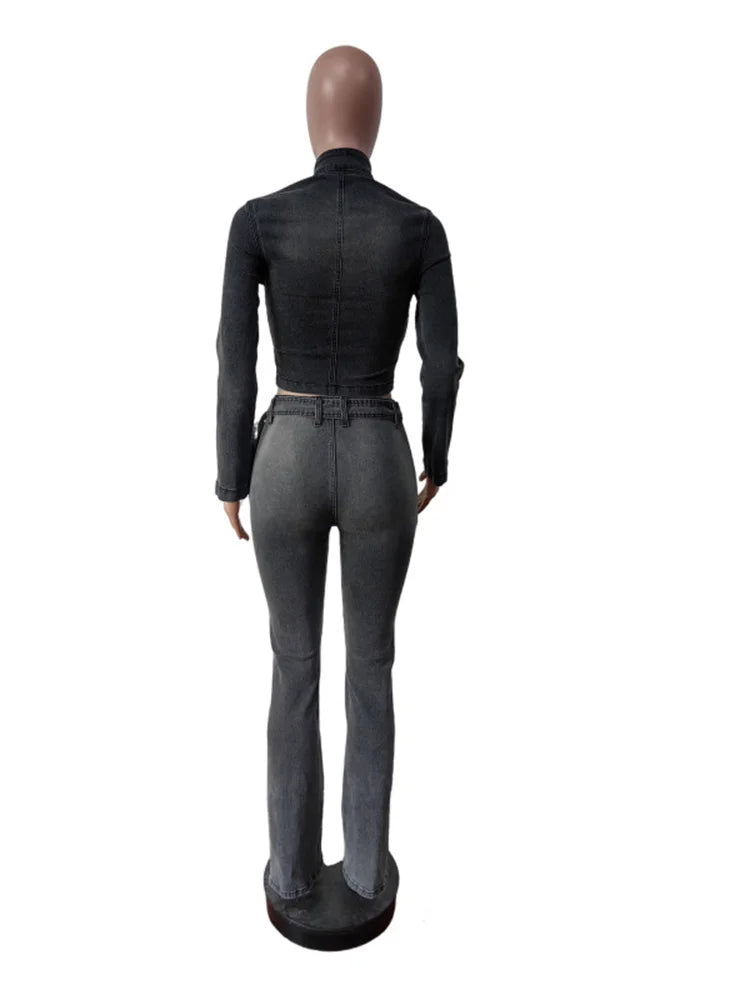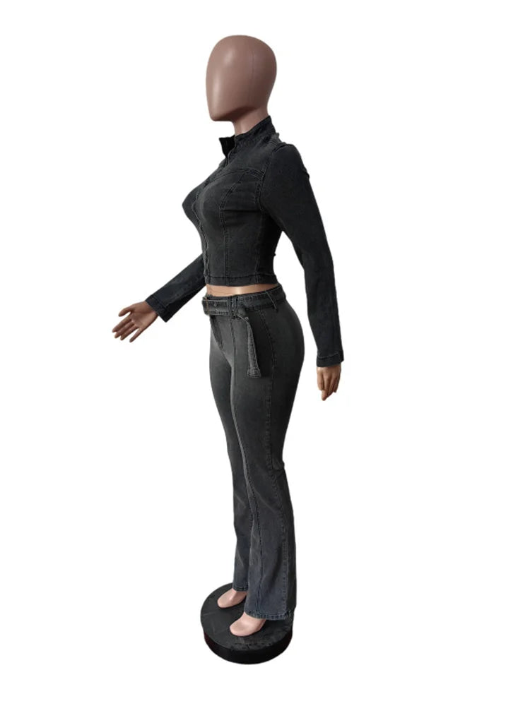 Fashion 2-Piece Set Women Denim Vintage Zip Jacket+Belt Pants Matching Skinny Casual Punk fall Stretch Streetwear Outfits