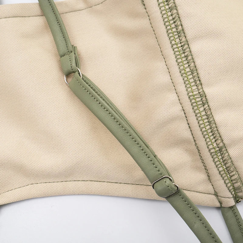 Fashion Heart Metal Trim Faux Leather Mini Dress Woman Lace-Up Halter Deep V-Neck Backless Hot Girls Street Sexy Bodycon