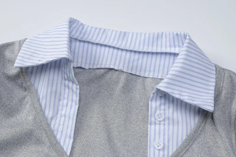 Fashion Patchwork Button Up Short Sleeve Shirt Dress Woman Clothes Office Casual White Black Grey Mini Dress
