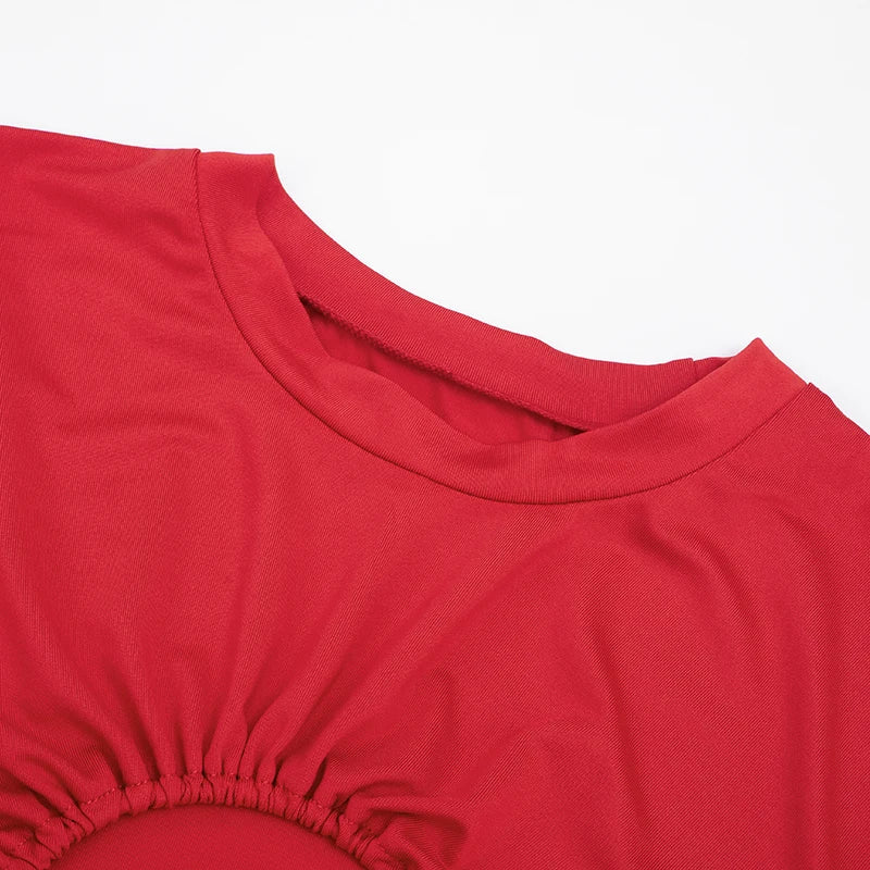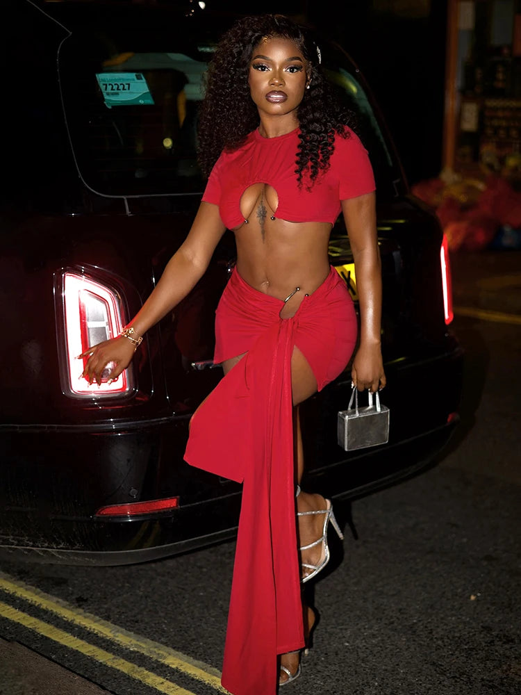 Fashion Summer 2Piece Set Women Solid Shorts Sleeve Ruched Brooch Crop Tops+Irregular Ribbon Skirts Matching Club Outfits