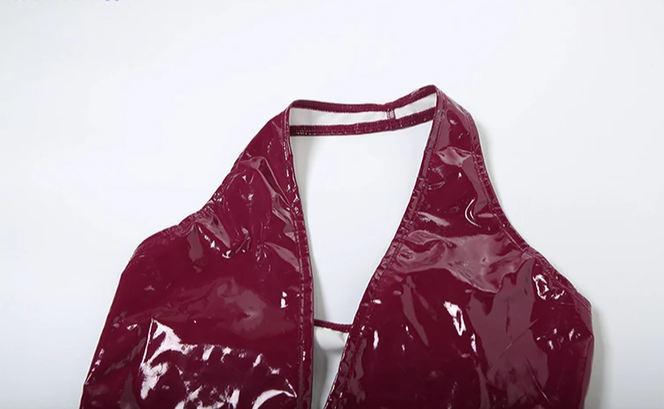 Faux Leather Sex Set Women Low-Neck Halter Sleeveless Bodysuit+Zipper Waist2 Piece Stretch Pant Clubwear Trend Suit