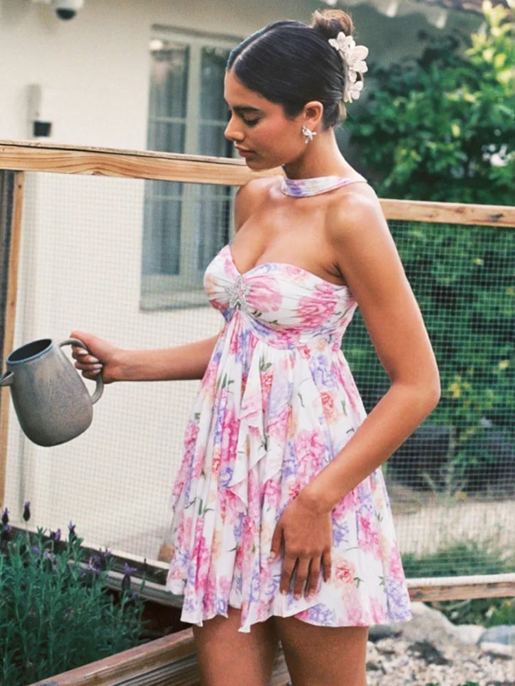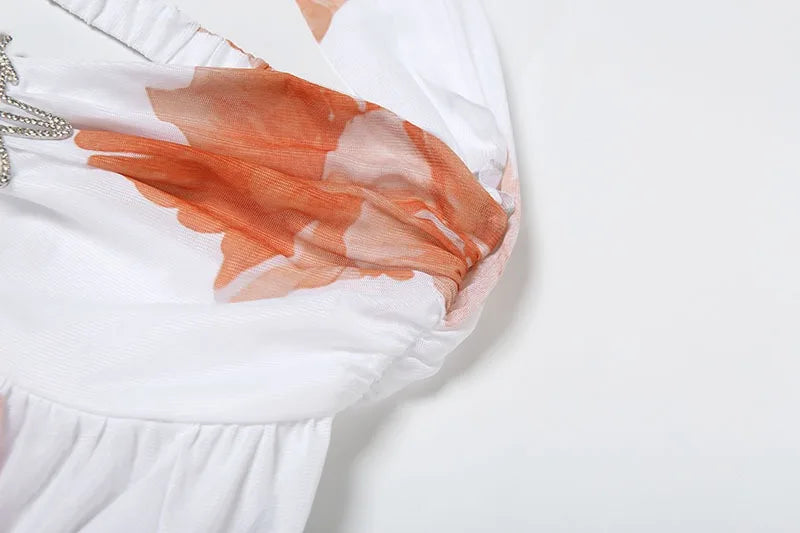 Floral Mesh Dresses Off Shoulder Halter Backless Irregular Mini Dress Sexy Outfits Woman Clothing