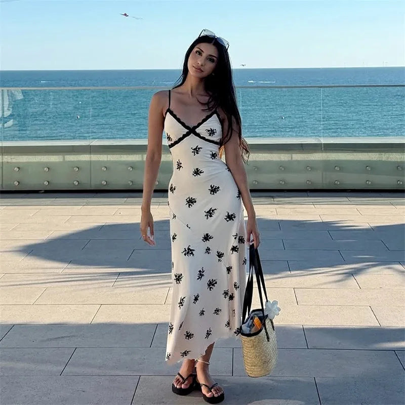 Floral Print Summer Dress French Style Elegant Deep V Neck Sleeveless Backless Long Dresses for Woman 2026
