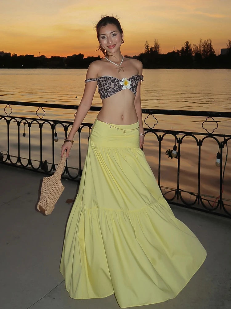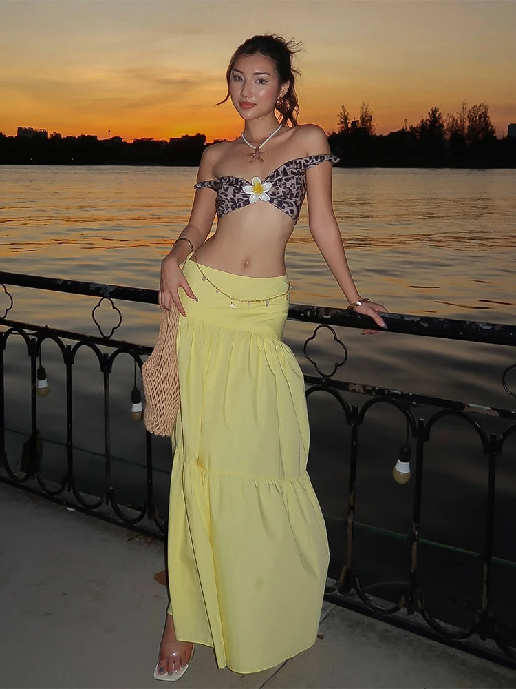 Flower 2 Piece Set Women Sexy Backless Leopard Print Slash Neck Tops+Pleated Long Skirts Matching Clubwear Outfits