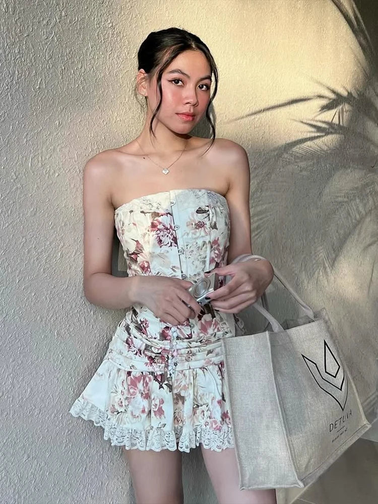 Flower Print 2-Piece Set Women Y2K Single-Breasted Metal Buckle Wrap Top+Lace Folds Hem Skirt Sweet Matching Suits