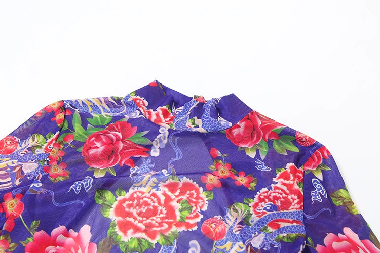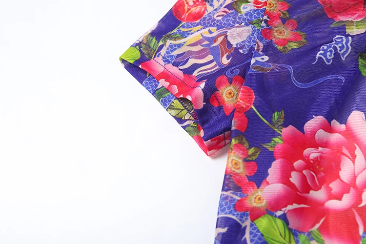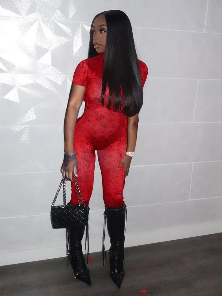 Flower Print Jumpsuits Women Turtleneck Short Sleeve Backless Skinny Peach Hip Midnight Club Party Fashion Overalls