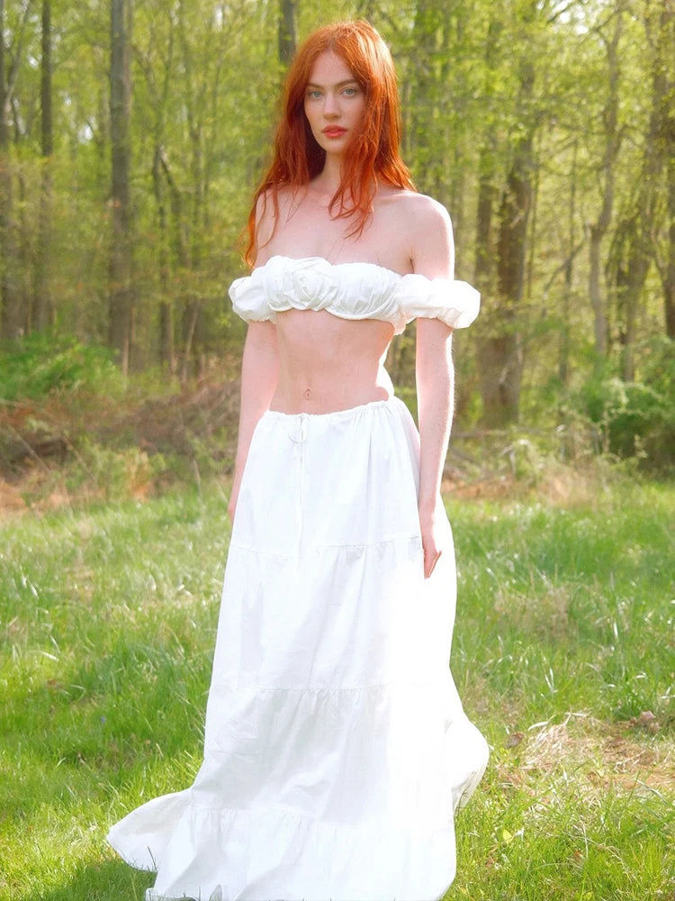 Folds 2Piece Set Women 3D Flowers Elegant Puff Sleeves Slash Neck Crop Tops+Lace-Up Skirts Sweet Matching Summer Suit