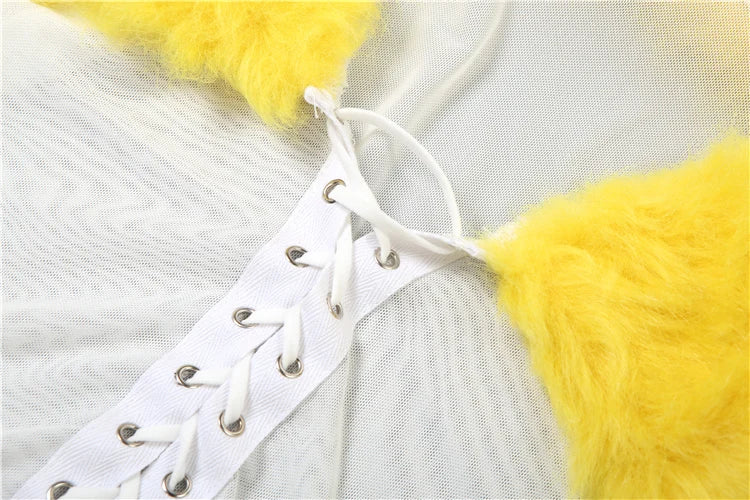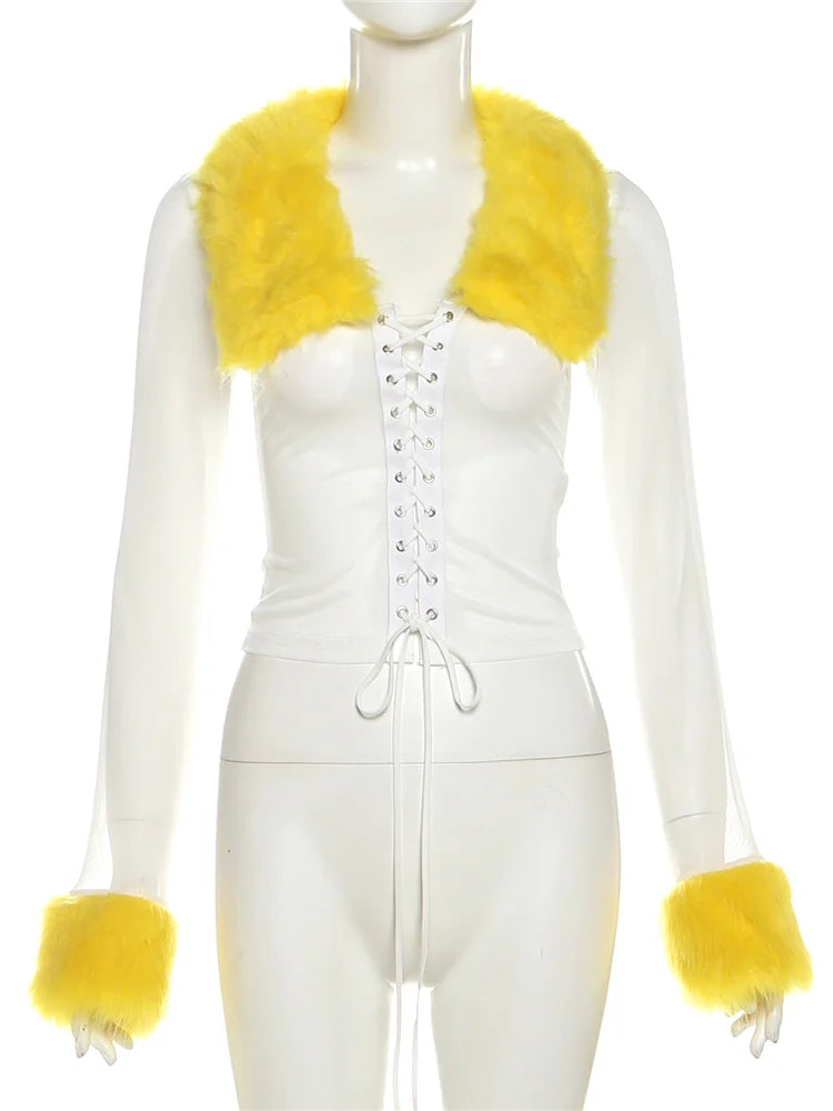 Furry Patchwork 2 Piece Set Women Hipster Mesh Shirring Full Sleeve Crop Tops+Bike Shorts Skinny Y2K Street Clubwear