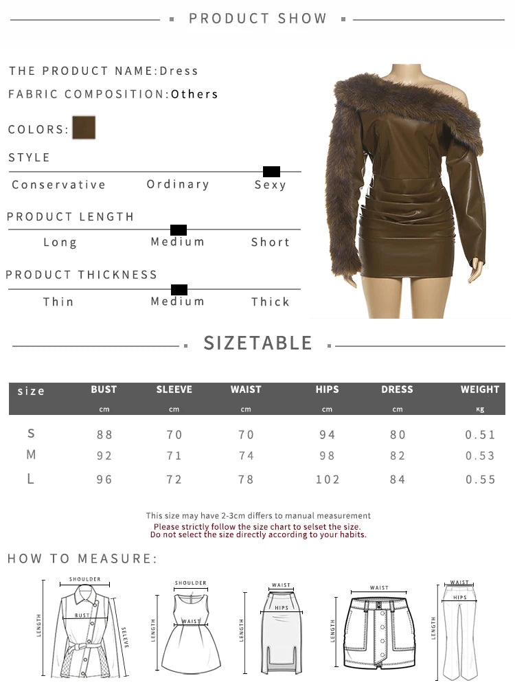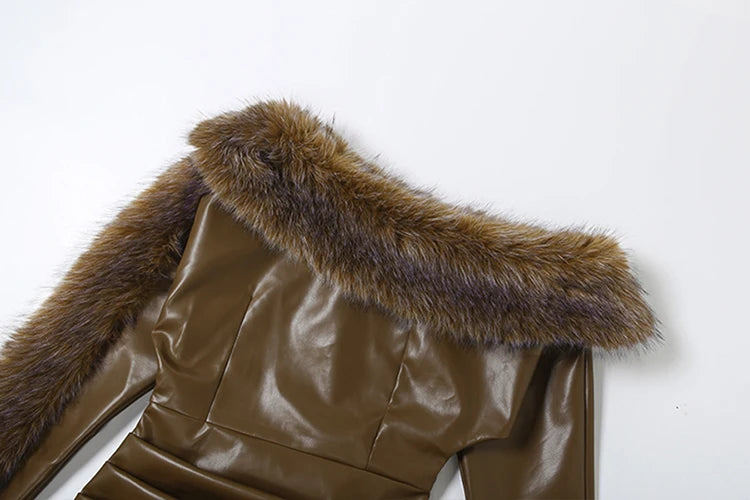 Furry Patchwork Mini Dresses WomanFaux Leather Skew Collar Full Sleeve Backless High Waist Fashion Classic Mini Bodycon