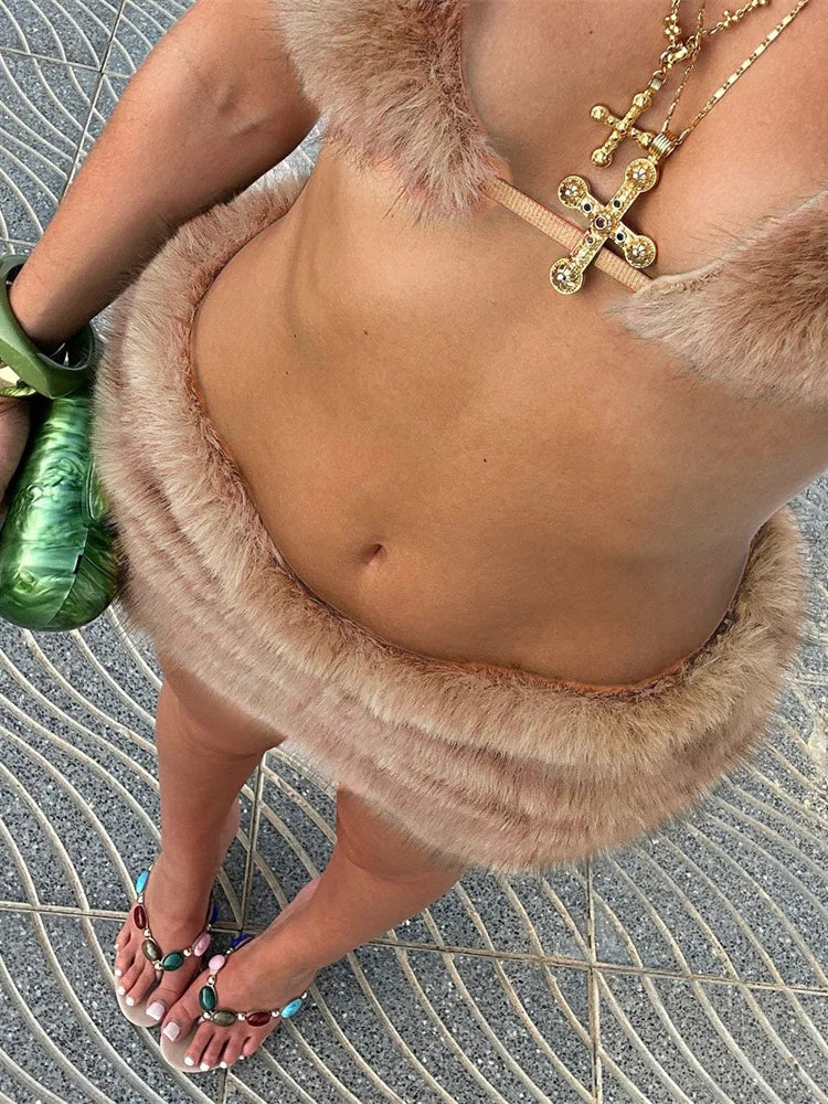 Furry Skirts Women Y2K Vintage Folds High Street Sexy Midnight Hottie Wild Party Simple Classic Club V-Waist Bottoms