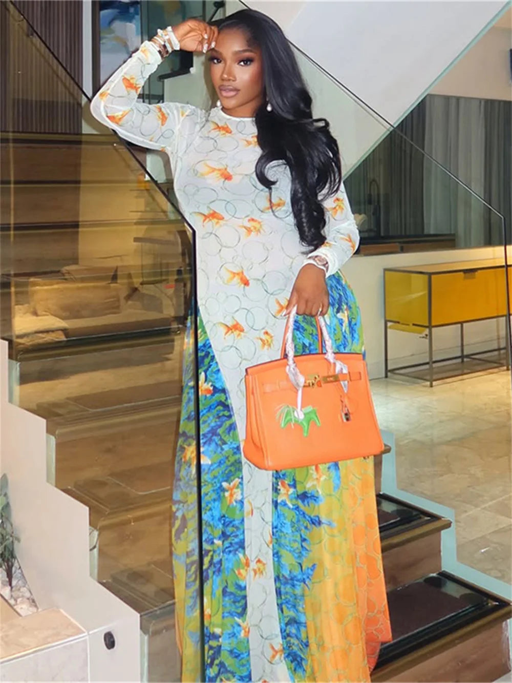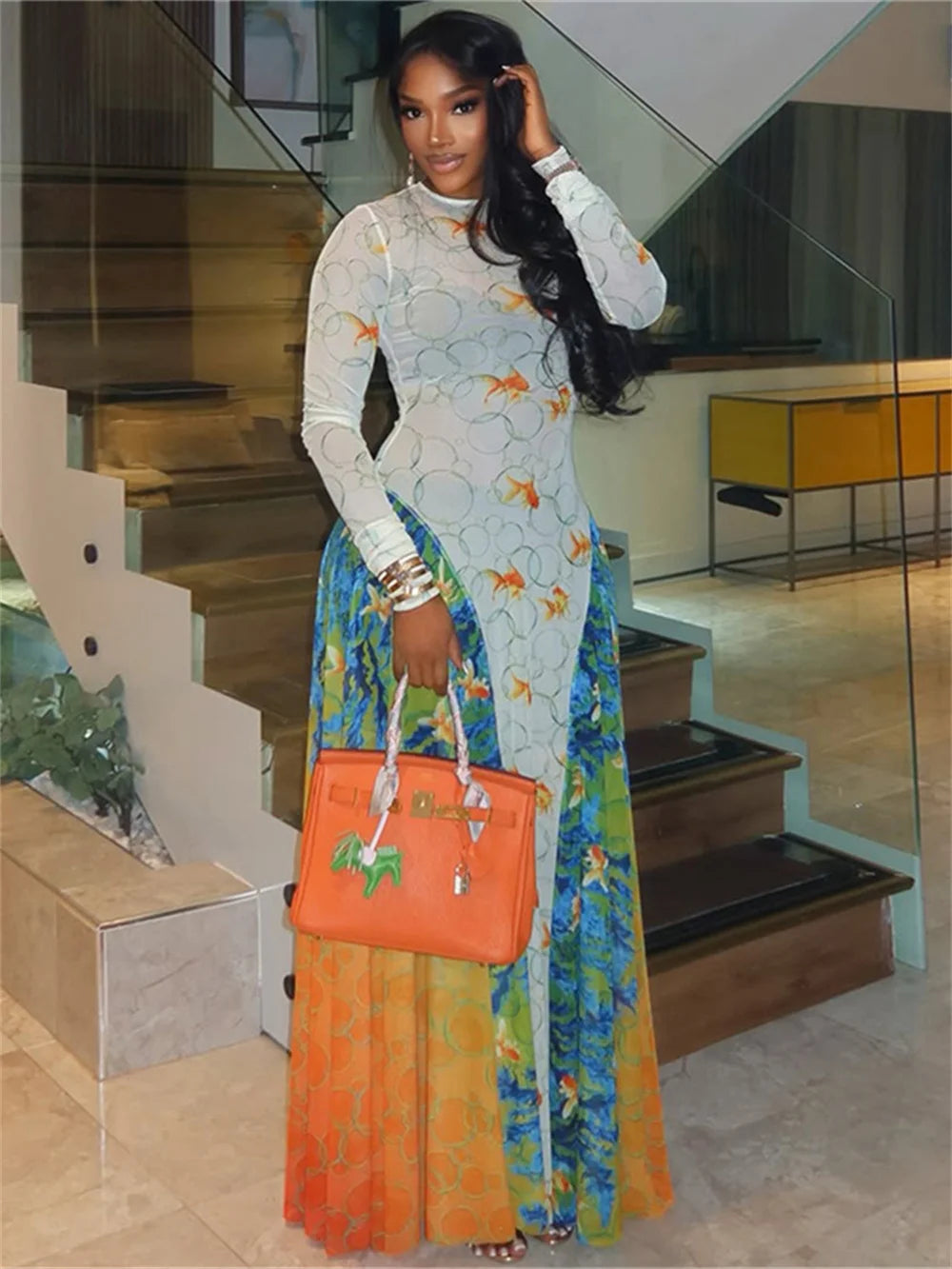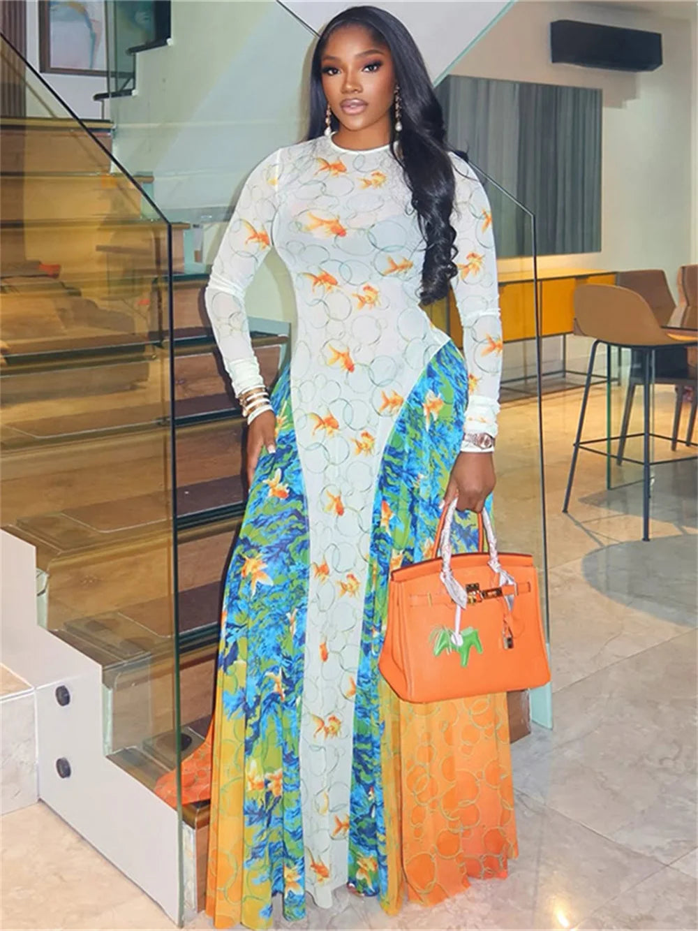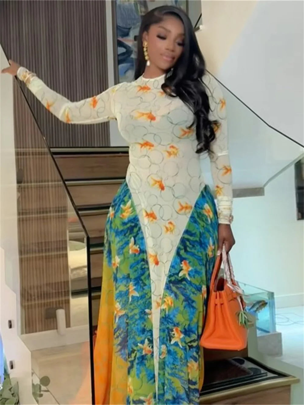 Goldfish Print Patchwork Dress Women Sexy See Through Long Sleeve Y2K Skinny Party Midnight Clubwear Party Vestidos