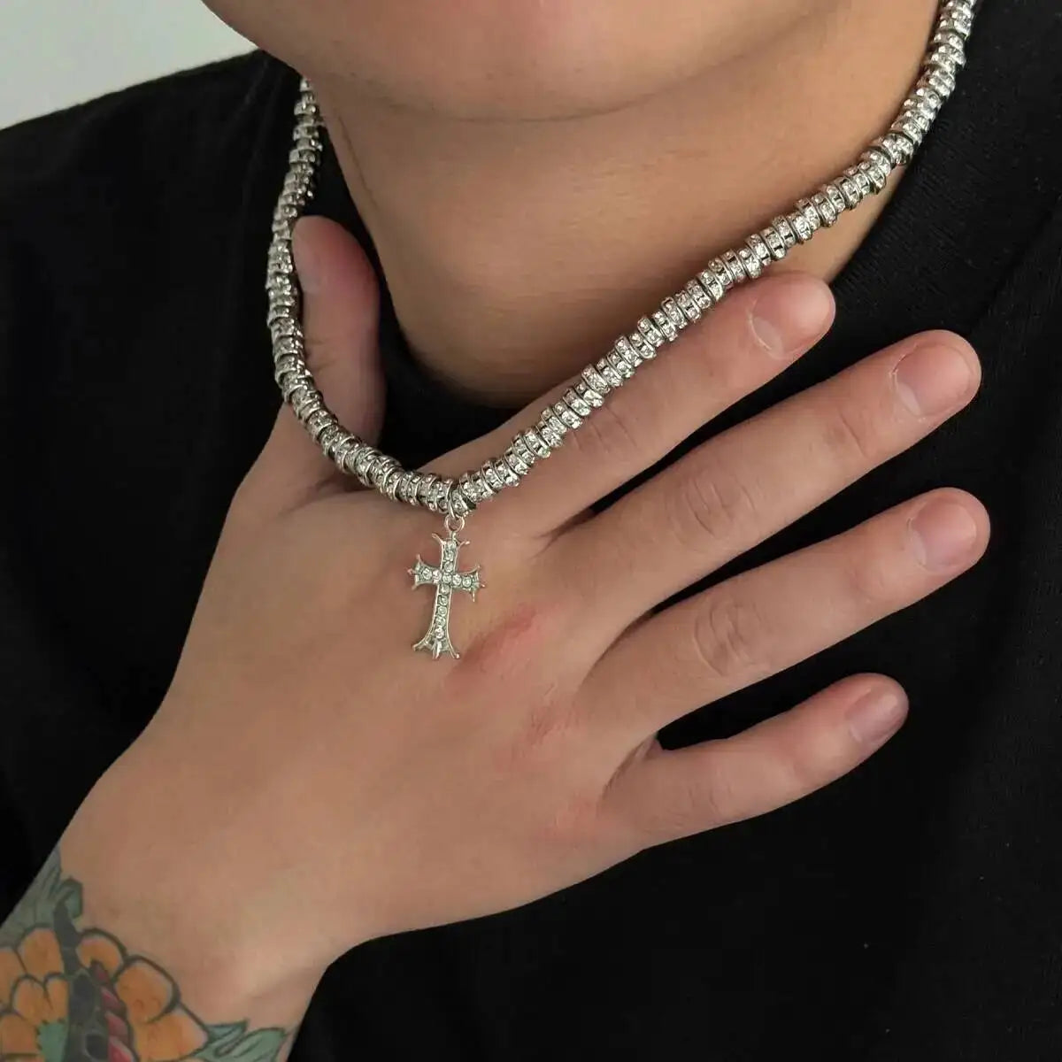 Gothic Jesus Cross Pendant Necklace Men Hip Hop Retro Rhinestone Circular Beaded Choker Necklace Couple Jewelry Gifts