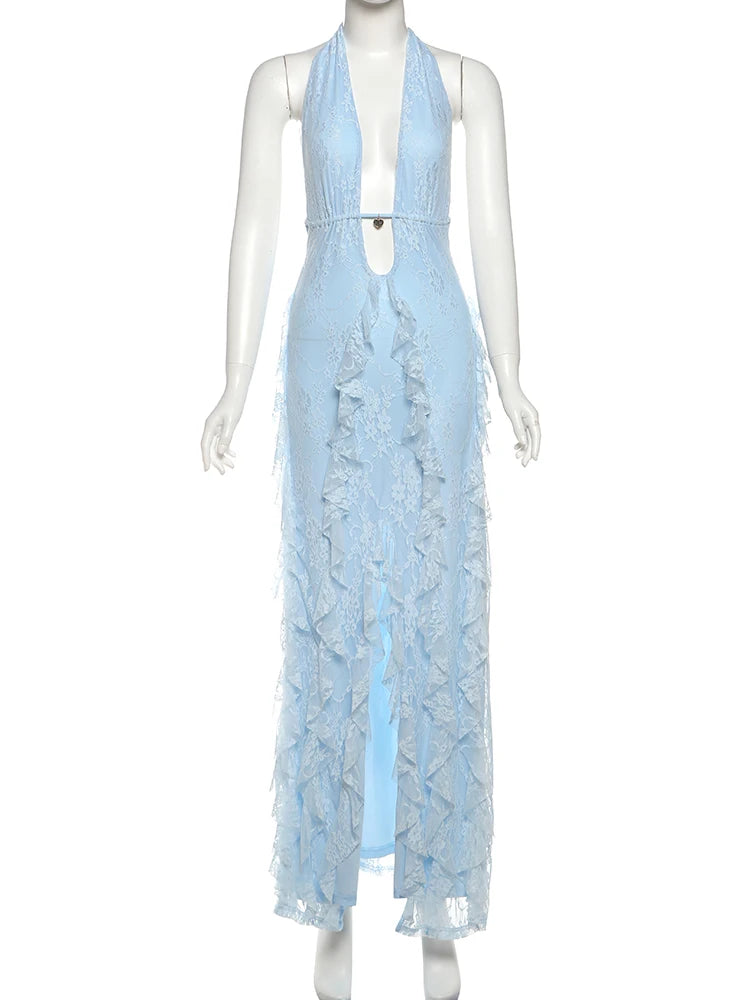Halter Deep V-Neck Dress Women Elegant Mesh Tassel Patchwork Backless Split Skinny Jacquard Sleeveless Maxi Bodycon