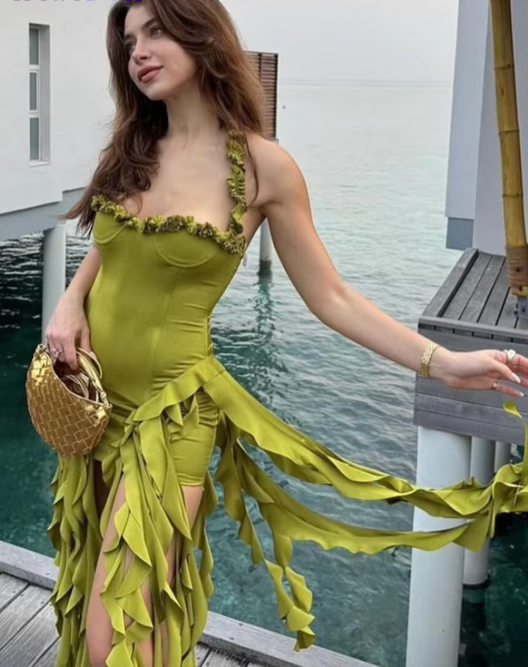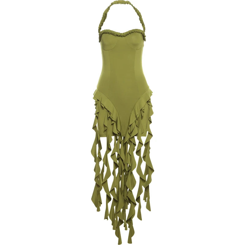 Halter Party Dress Women Backless Chic Irregular Tassel Hem Summer Sexy Birthday Party Split Midnight Club Bodycon