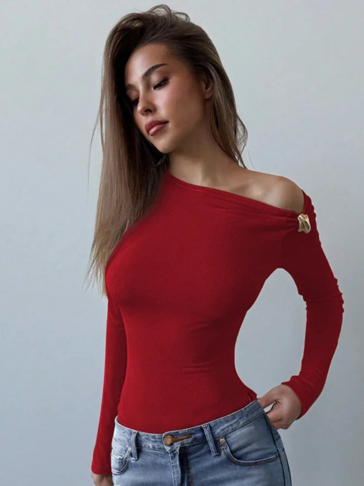 Hardwear Detail One Shoulder Long Sleeve Top Solid Color Sexy Tight Fitted T Shirts Woman Fall 2025 Fashion