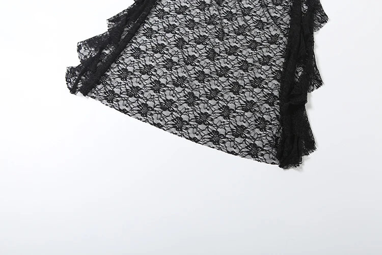 Irregular Hem Dress Women Slash Neck Sexy See Through Bandages Jacquard Lace Full Sleeve Ruched Ruffled Party Bodycon