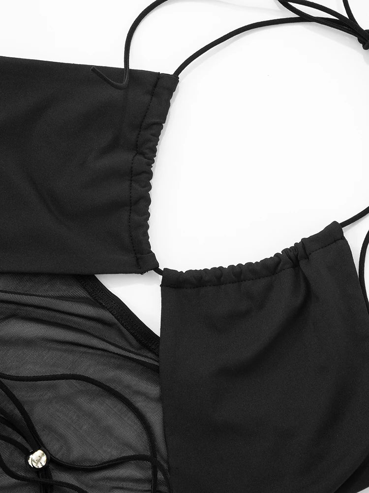 Irregular Hollow Playsuits Women Beads Mesh Patchwork Lace-Up Halter Backless Midnight Sexy Coquette Skinny Romper