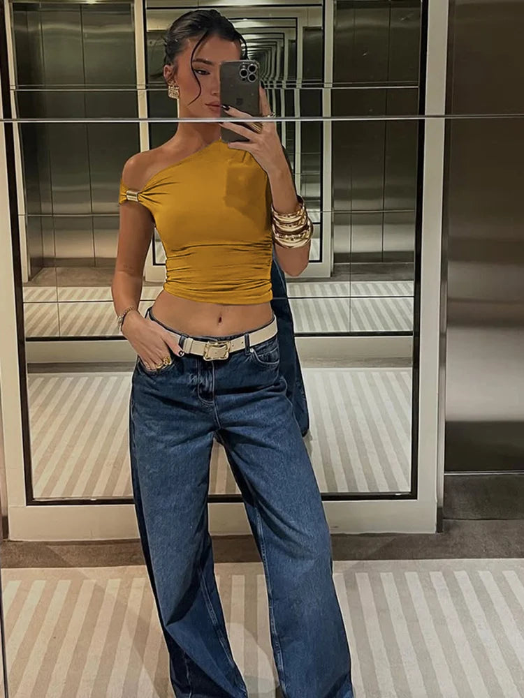 Irregular Off Shoulder T-Shirts Women Ruched Fashion Skew Collar Single Sleeve Daily Casual Solid Simple Streetwear