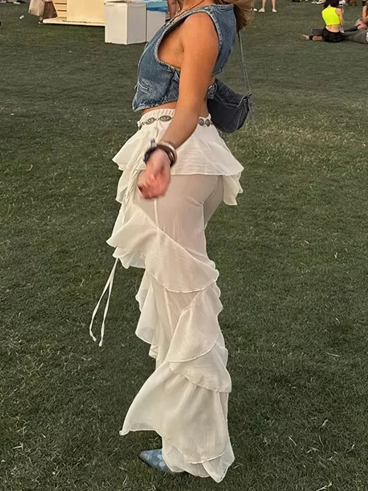 Irregular Tierred Flare Pants Women Y2K Patchwork See Through Summer Hipster Wild Basic Street Trend Classic Trousers