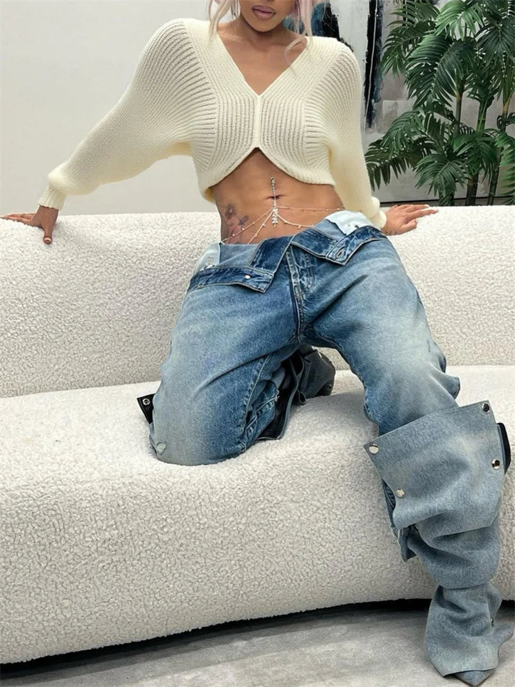 Knit Crop Sweater Women Y2K Lantern Sleeve Casuals Autumn Simple Classic Comfortable Elegant Basic V-Neck Loose Tops