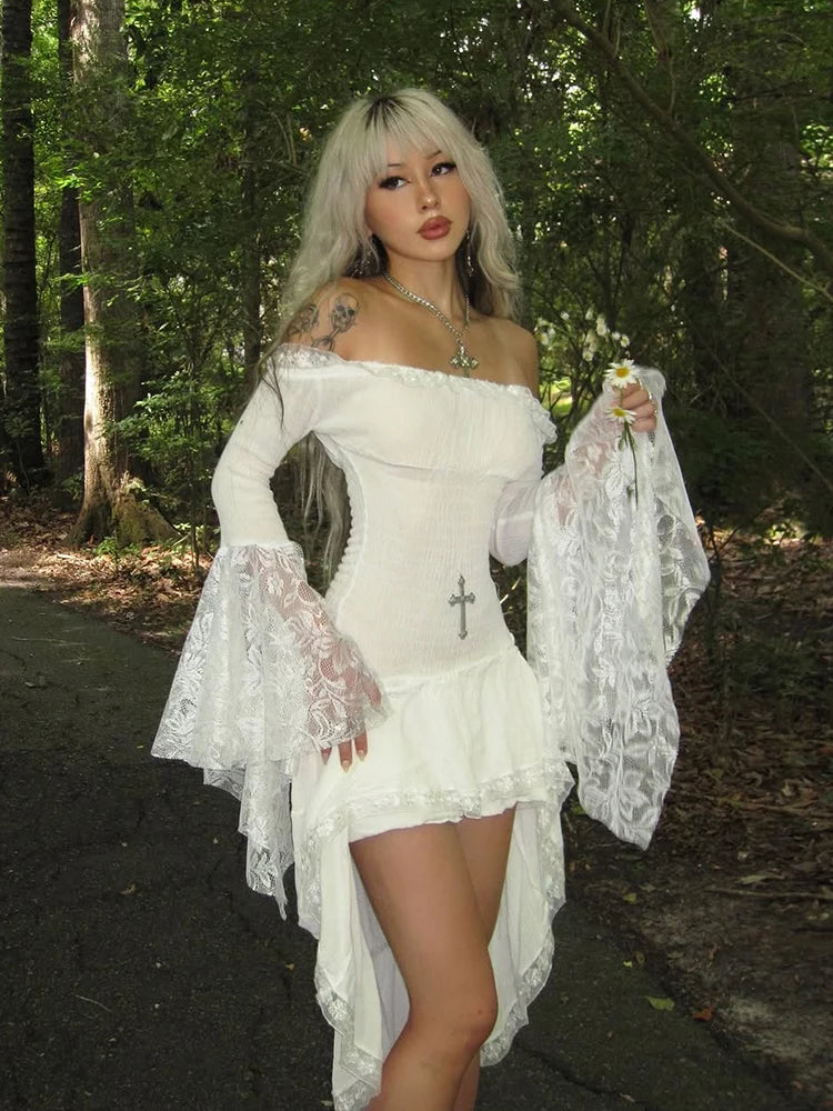 Lace Irregular Patchwork Dress Women Slash Neck Jacquard Flare Sleeve Sexy Birthday Halloween Stretch Skinny Bodycon