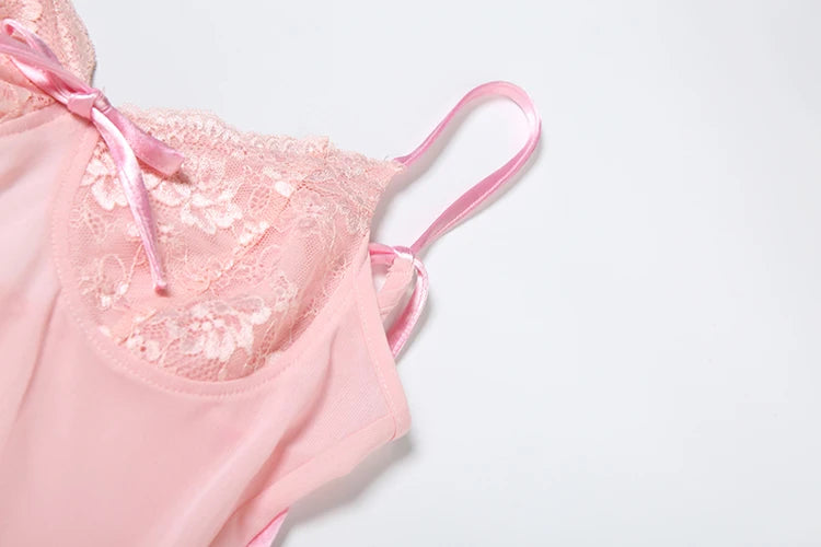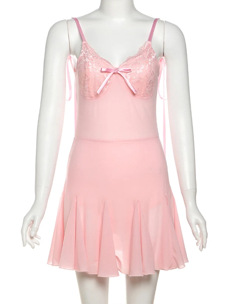 Lace Patchwork Dress Women Backless Bow Lace-Up Sleeveless Thinny Pleated Solid Midnight Clubwear Party Mini Bodycon