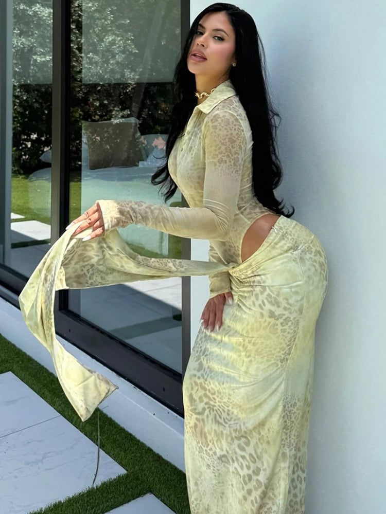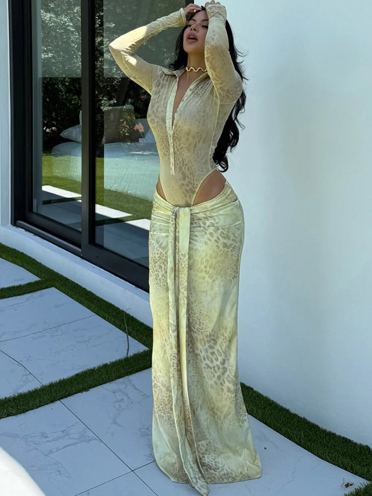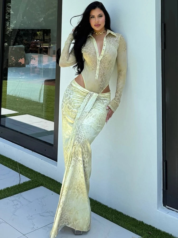 Leopard Print 2 Piece Set Women Sexy Y2K See Through Bodysuit+Ruched Ribbon Thick Skirts Matching Vacation Clubwear