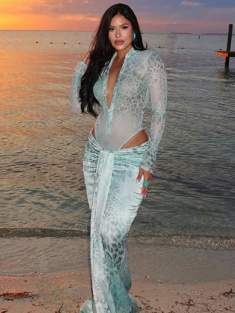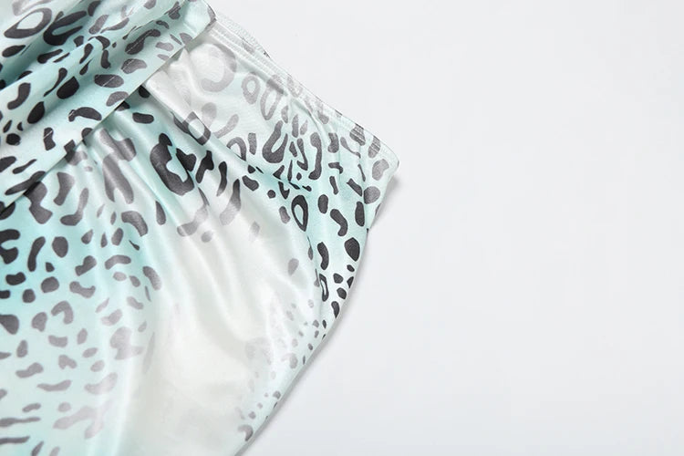 Leopard Print 2 Piece Set Women Sexy Y2K See Through Bodysuit+Ruched Ribbon Thick Skirts Matching Vacation Clubwear