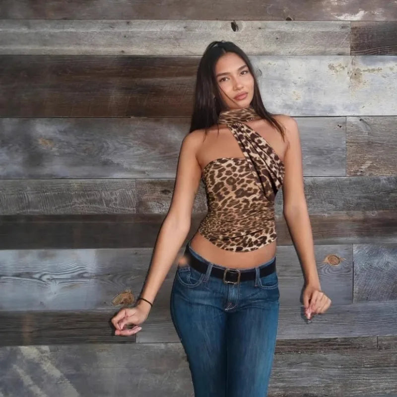 Leopard Print Sexy Crop Tops for Woman Clothing Asymmetrical Backless Halter Top Clubwear Summer 2025