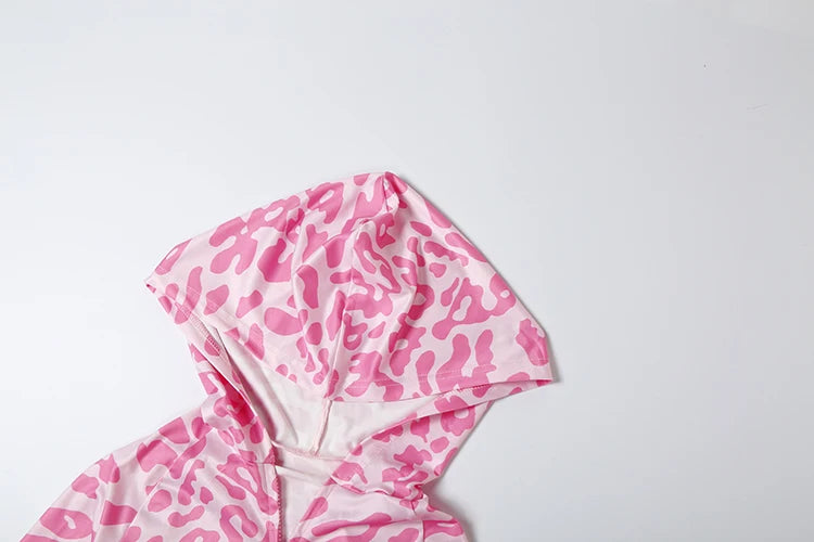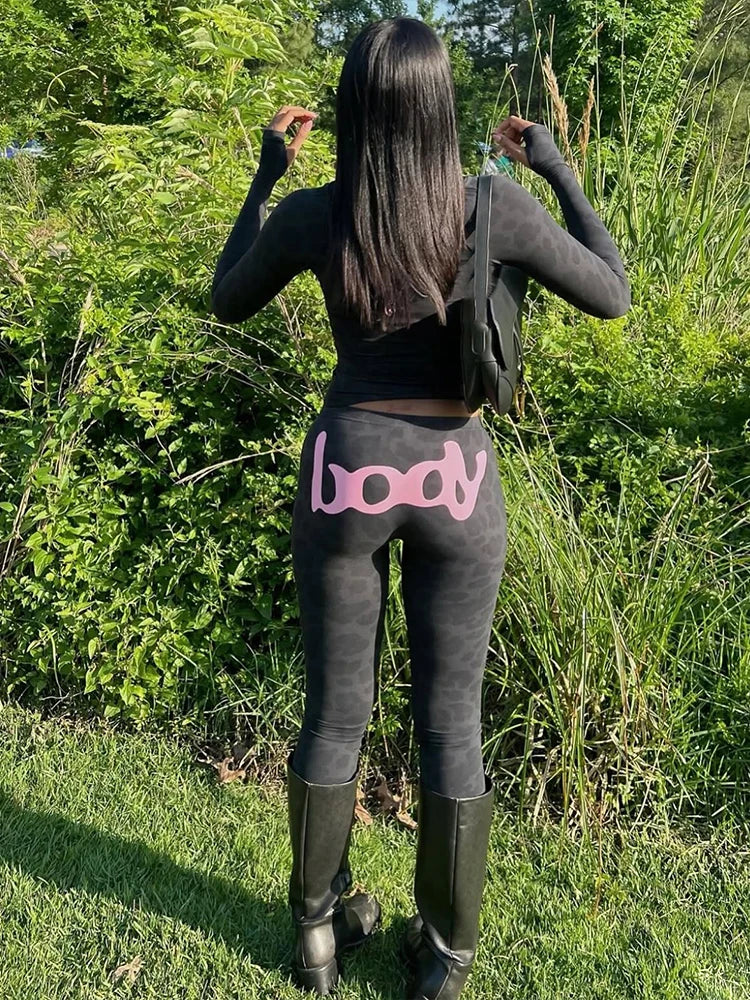 Letter Leopard Print 2 Piece Set Women Casual Zip Hooded Crop Jacke+Leggings Matching Stretch Sporty Street Outfits